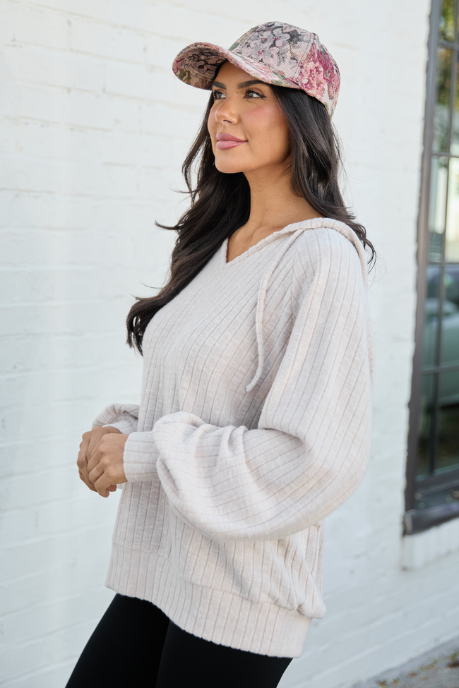 Baylor Beige Balloon Sleeve Ribbed Hoodie