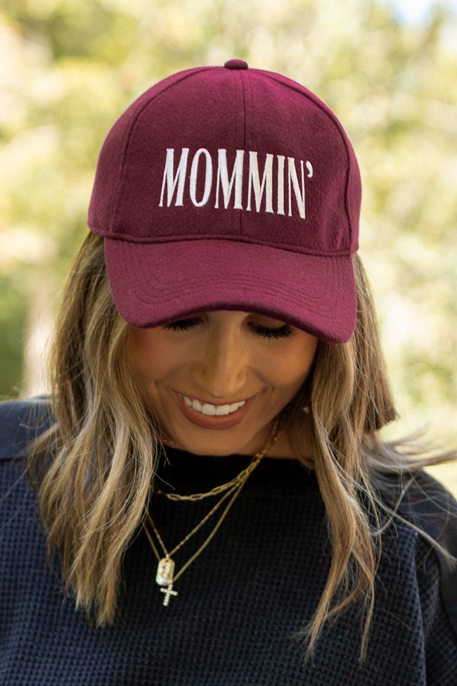 • Burgundy felt baseball cap with an embroidered mommin’ design