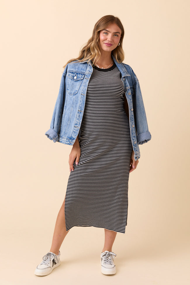 Emmie Lou Black Striped Ribbed Knit Maxi Dress