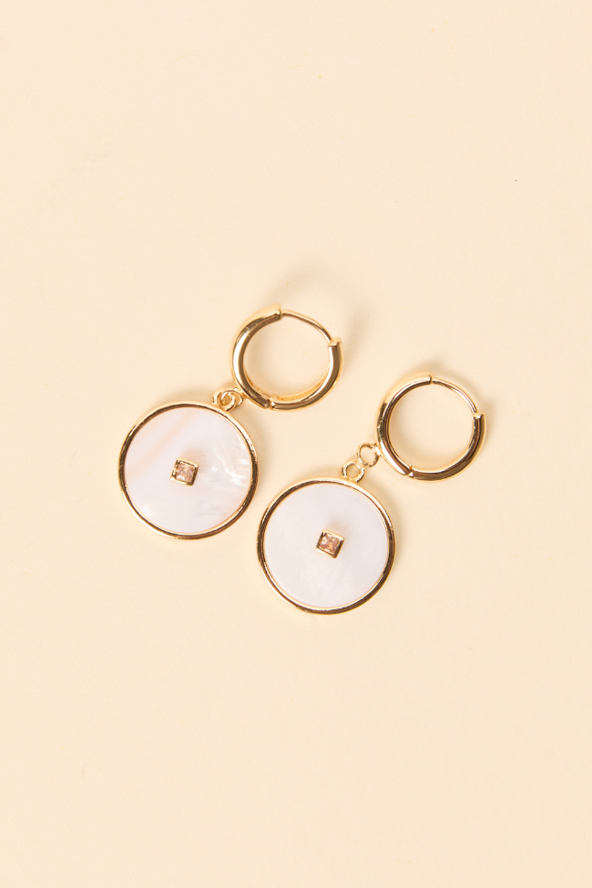 - Dyed Mother of Pearl white disc earrings with middle clear crystal detail