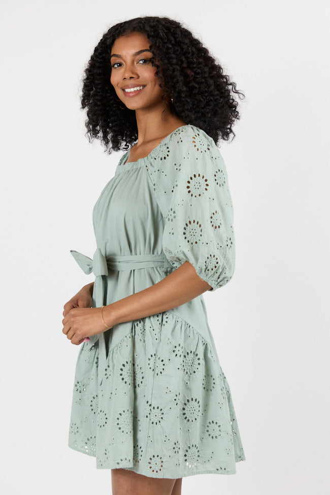 - Elastic neckline. off the shoulder style. tie belt. eyelet material
